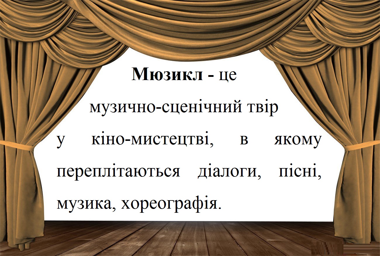 Мюзикл - це музично-сценічний твір, у якому переплітаються діалоги, пісні, музика, хореографія.